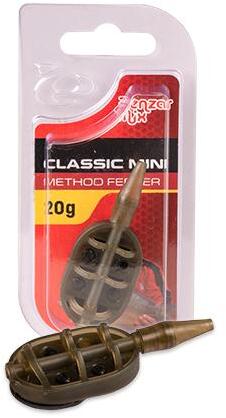 Benzár Classic Mini Method kosár A method módszer lelke sokak szerint a megfelelően elkészített etetőanyagban rejlik. Ebben igazuk is van, de a végszerelék részét képző kosárra is érdemes figyelmet fordítani.   Az új Benzár Classic Mini method kosár akár a partközeli vagy kereső feederes pecákhoz is tökéletes alternatívát nyújt, méretskálájának köszönhetően.   Bármely, a method technikával alkalmazott és közkedvelt csalihoz tökéletes megoldás, legyen szó waftersről, popupról vagy bármilyen süllyedő csaliról, sőt a legújabb Expanda pelletekkel is tökéletes összhangot képvisel. A Classic Mini mérete miatt, akkor is megfelelő alternatívát jelent, mikor a halak finoman vagy alig táplálkoznak és azokat csak egy kis mennyiségű, de prémium etetőanyaggal lehet a csali közelébe terelni. A ponty mellett, keszeg-kárász és kisebb halak horgászatához is jó opció. Áramvonalas kialakítása rendkívül jó dobhatóságot eredményez, kis mérete ellenére is. Versenykörülményekhez is kifejezetten ajánljuk a szériát, de a hétköznapi pecák alkalmával sem fognak csalódást okozni.